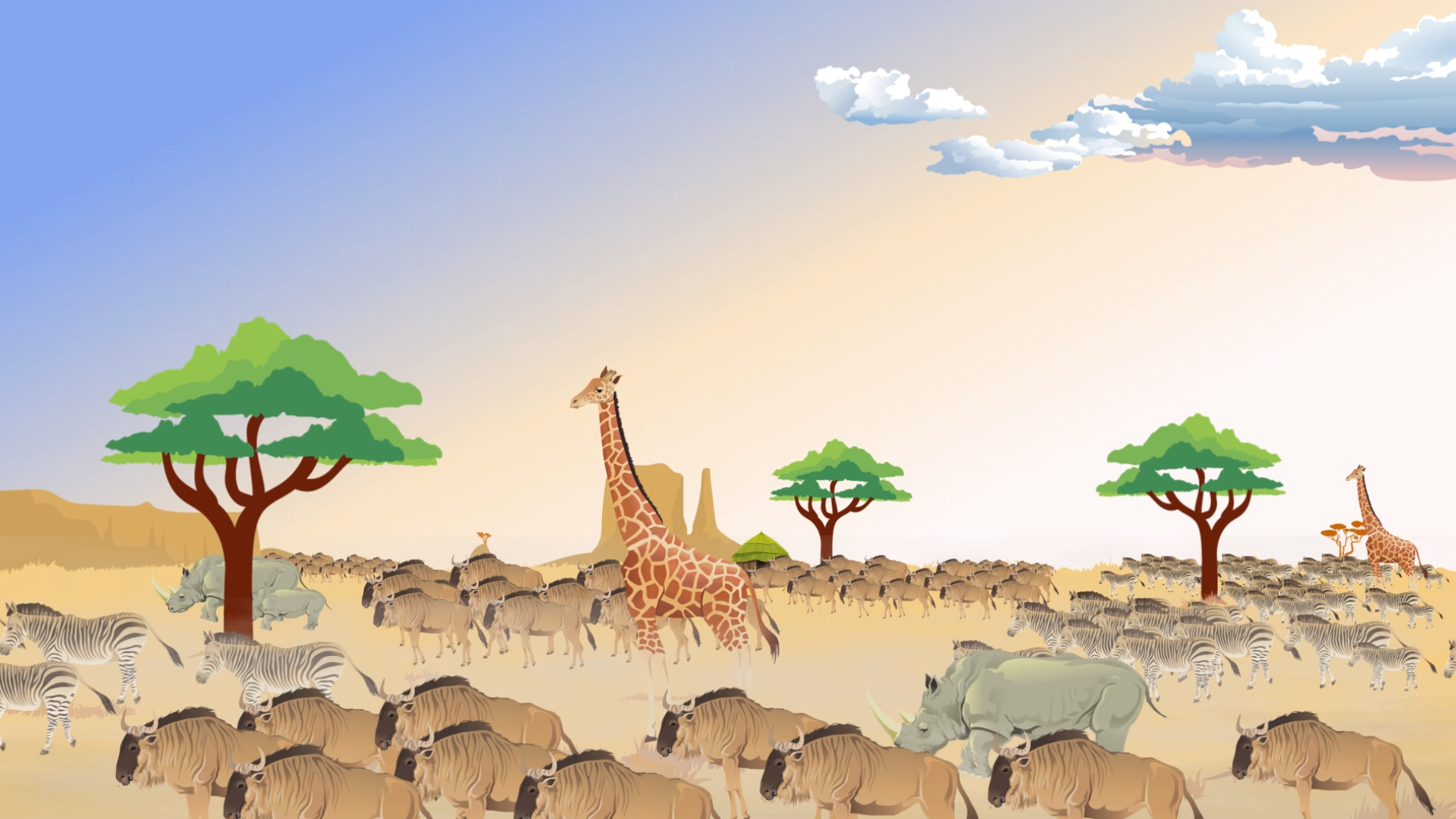 一望无际的非洲草原上奔跑着各种非洲动物,马赛人的部落,以及马赛人放牧、奔跑、弹跳、眺望远处事物的镜头